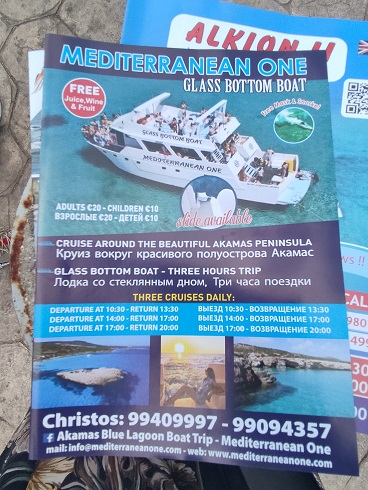 A Manolis Bay, al lago azul…Y mientras que iba guardándolos vimos un barco que hacía tres excursiones al día de tres horas cada una. La última salida era de 17 a 20, y nos daba a tiempo a cogerla. Además, incluía fruta, vino blanco y zumos gratis durante la hora y pico que paraba en el lago azul para que la gente se bañase. Su precio era de 20€ por adulto, os dejo aquí el folleto. Tenía el suelo de cristal para que pudieras ver el fondo.