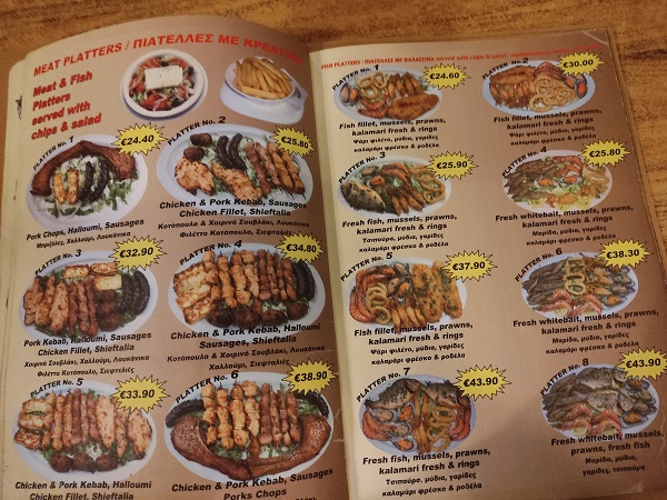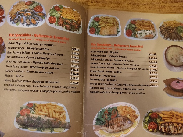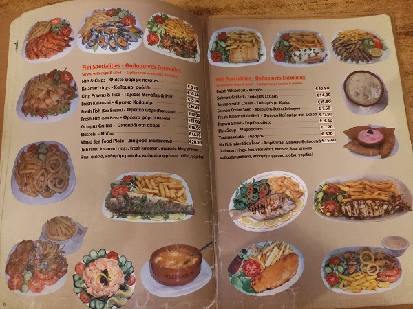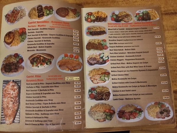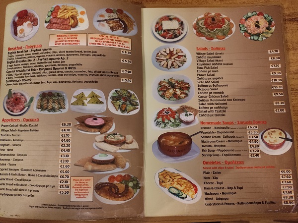 Como habréis visto no os he recomendado ningún restaurante hasta el momento porque ninguno me pareció estupendo, pero en Larnaca sí hubo uno que nos encantó y repetimos varios días aquí os dejo la carta porque las raciones eran enormes y todo estaba riquísimo, además de que era de los que tenían mejor precio de toda la zona. Se llamaba restaurante Alexander y estaba en el mismo paseo marítimo.