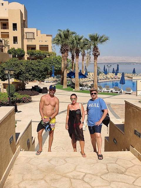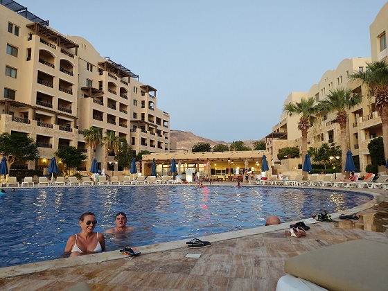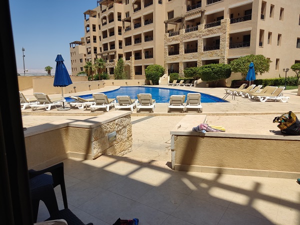 De aquí nos fuimos a nuestro alojamiento con Airbnb que fue un acierto total, era un estudio para 4 y la verdad es que no tenía ninguna habitación, dormimos los 4 en el salón en dos sofás dobles. Pero las instalaciones de la urbanización eran impresionantes, salías del estudio y tenías la piscina a tus pies, con vistas al mar muerto. Un restaurante en el que comimos fenomenal. Un acierto total y las dos noches nos costó 129€. Había sábanas, pero no toallas, así es que pedírselas porque yo creo que fue un olvido.