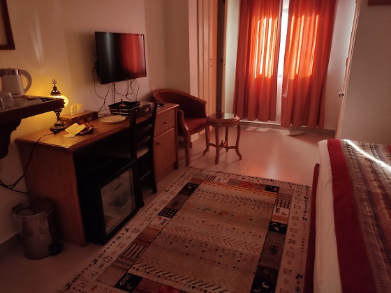 Y aquí os dejo el hotel revelación del viaje Layaali Amman Hotel teléfono: 962787707701, estaba tan bien situado y era tan barato que me daba un poco de miedo. La doble con baño en la habitación y con desayuno bufet incluido valía 20€. Lo elegimos porque era céntrico y su puntuación en booking era muy buena. Aunque la realidad es que me esperaba algo que no iba a dar los mínimos, únicamente prejuicios por el precio que resultaron ser un error. Y cuál fue mi sorpresa cuando me encontré con una habitación nueva, grande, la nuestra tenía una terraza, un aire acondicionado que funcionaba genial y en pleno centro de Amann, desde arriba podías ver el teatro, encima te mandan un plano de un parking gratuito que hay a dos minutos del hotel. Y el desayuno bufet muy digno. Durante todo el día te invitaban a a café, té, y una nevera llena de refrescos y chocolatinas para que te sirvas.