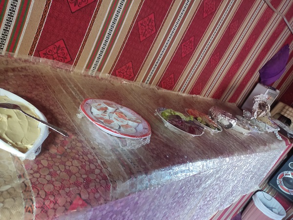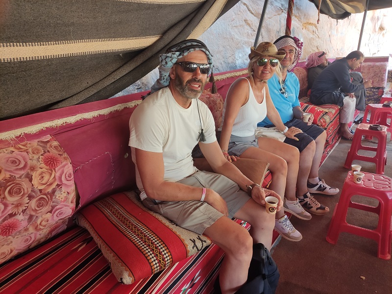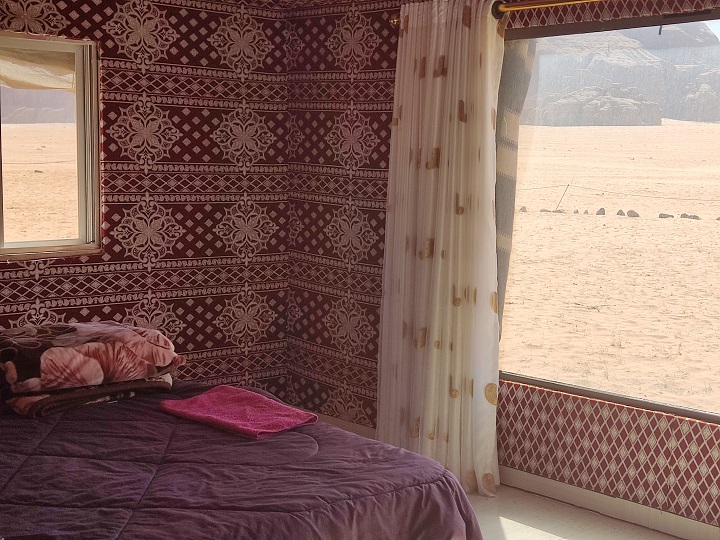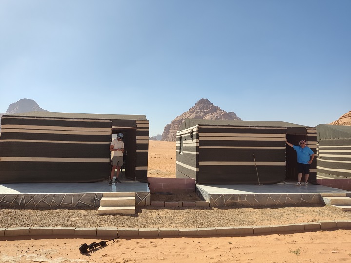 Nos llevaron de nuevo a nuestro alojamiento y nos dijo que en 10 minutos estaba la cena preparada. Las tiendas eran enormes, con baño privado, y el precio un regalo puesto que cada tienda con baño privado dentro y desayuno bufet incluido nos costó 10JD. Un regalo, nosotros estuvimos fenomenal, pero en la de al lado a la nuestra no se podía abrir la ventana, nuestros amigos nos dijeron que pasaron mucho calor por la noche porque a las 00 quitan la electricidad.