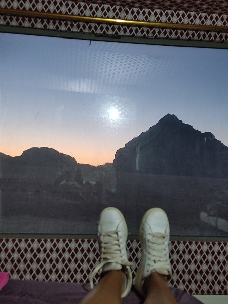 Alrededor de la 13 pusimos rumbo a Wadi Rum ya que habíamos quedado en vernos con el chico de nuestro campamento a las 15. Este día comimos dentro del coche de camino todo lo que habíamos recogido del hotel, varias frutas, unas galletas saladas y chocolatinas. Del hotel nos mandó la ubicación de donde nos esperaría. Y allí mismo dejabas ya el coche aparcado y pasabas al jeep con el que él había venido. Antes de la excursión nos llevó a que viéramos las instalaciones y nos gustó bastante.