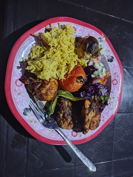 Desde allí cogimos rumbo a Petra. Nuestra idea era comer de camino, pero no encontrábamos nada de nada, hasta que llegamos un poblado más grande y leyendo en Google entramos en el que mejor nota tenía, era take away pero en un minuto nos prepararon una mesa con sillas y la comida estaba riquísima y la más barata de todo el viaje, os dejo aquí la dirección, pero no esperéis un restaurante lujoso, es un sitio donde va la gente local va a llevarse arroces cocinados a casa. El nombre es Al-Salea Gate Castle Restaurant