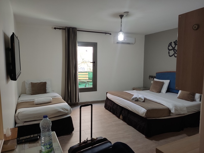 Desde España nos habíamos descargado el mapa de Jordania con Google maps para así no gastar datos. Y nos llevó perfectamente a nuestro hotel en Amman, habíamos contratado este porque no estaba en el centro de la ciudad, tenía parking gratis, baño privado en la habitación y desayuno bufet con bonitas vistas desde la terraza.