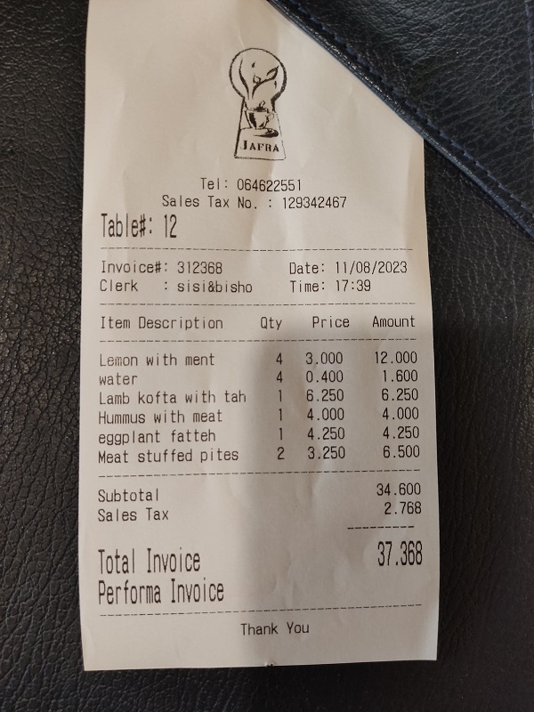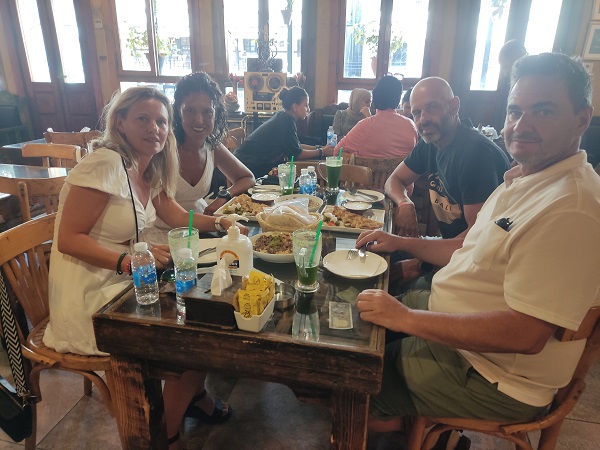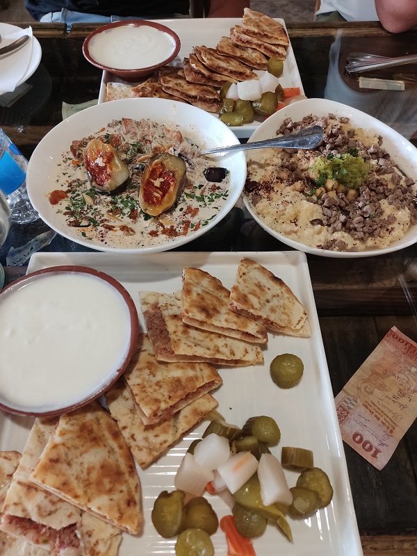 Jafra restaurante and Café, el lugar era precioso, había mucha gente local, probamos vuestras recomendaciones y pedimos una limonada con menta fresca, dos variedades de fatteh y los arayes, todo impresionantemente rico, las raciones enormes y buen precio: