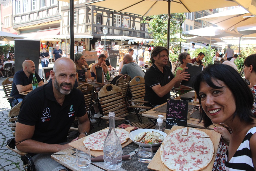 Pues nosotros comimos una ensalada de queso de cabra cada uno, muy rica y la tarta alsaciana que es como una pizza, pero con la masa mucho más crujiente y mucho más fina, como la masa filo, y flambeada, con nata, bacón y cebolla. A nosotros nos pareció riquísima.