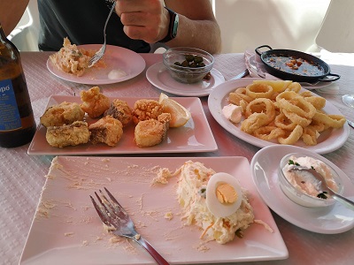 Por 28 euros comimos 4 raciones generosas de calamares, bacalao, gambas pil pil y una ensaladilla rusa casera riquísima, dos refrescos y dos cafés.