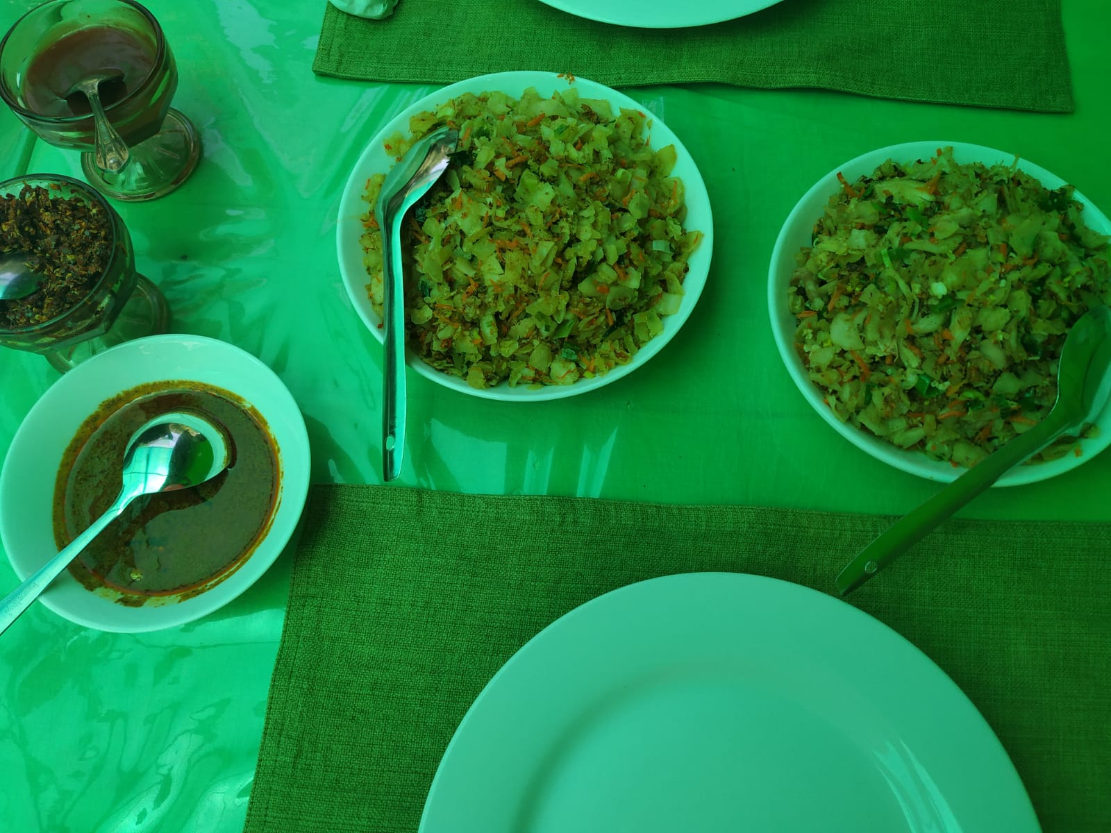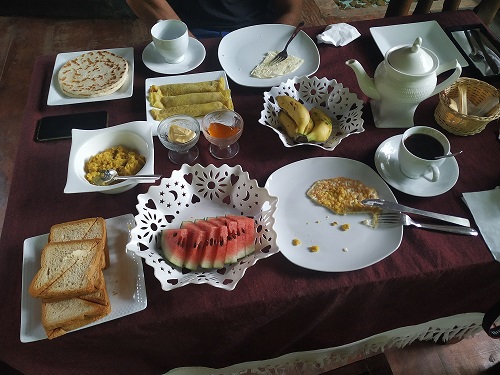 La comida me ha encantado, los desayunos de Sri Lanka, durmieras donde durmieras, han sido los mejores que he tomado en el mundo entero. Y no hablo de buffets, no, hablo de desayunos recién cocinados, con sus productos de allí, frutas recién cortadas exquisitas, panqueques recién hechos rellenos de coco u otras frutas, los egg Hopper que es como un crep con huevo y con cualquiera de las salsas que te servían a tu elección, eran exquisitos, nunca faltaban las tostadas con mantequilla y mermelada por si no nos gustaba la comida local, pero eran mesas enteras llenas de platitos que nunca podías acabar.