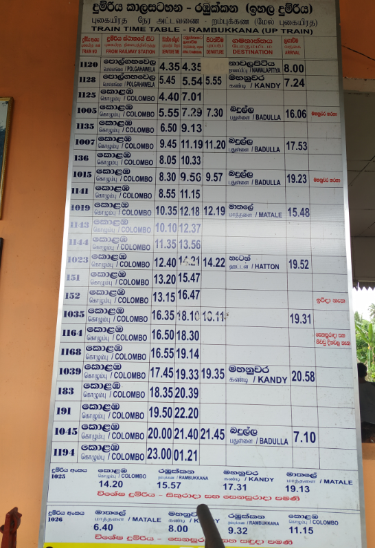 De Pinnawala a Kandy en tren: de opciones para ir de Pinnawala a Kandy, la mejor era ir a un pueblecito de al lado que tenía estación de tren, el pueblo se llama Rambukkana, un tuk tuk nos costó 300 rupias (1,5€) que nos llevara hasta allí desde el hotel, y una vez allí cogimos el tren a Kandy, que nos costó menos de 200rupias por persona (1€) Aquí abajo tenéis todos los horarios.