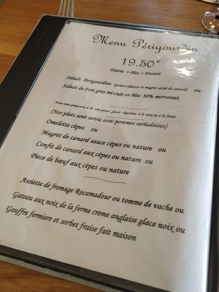 El restaurante que más me gustó del viaje, por si pasáis por allí, está justo en el camino de Rocamadour a Sarlat la Caneda, el pueblo se llama Rouffillac y el restaurante con el mismo nombre, lo veréis porque está en la misma carretera al principio del pueblo, aquí os pego foto del menú.
