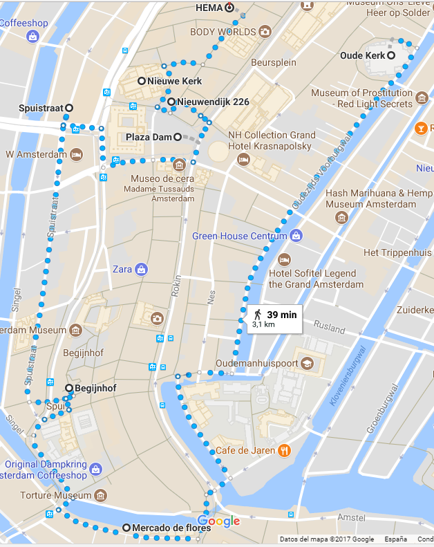 • DÍA 5 AMSTERDAM. Me había preparado dos rutas por Amsterdam para los dos días que íbamos a estar en esta ciudad, no quería que nos perdiésemos ninguno de los rincones tan bonitos de esta bella ciudad. Para el primer día comenzamos de nuevo en el barrio rojo, también queríamos verlo de día, , la iglesia preciosa de Oude Kerk , desde ahí vamos hasta Bloemenmarkt q es el mercado de las flores en el canal del Singel, de allí nos fuimos a hasta Bejinhof uno de los escenarios más bonitos de Amsterdam y un remanso de paz en la ciudad. Seguimos por la calle para ver sus increíbles Graffitis, y de allí hasta Plaza Dam y luego seguimos a hasta Nieuwendijk, la calle mas antigua de Amsterdam llena de tiendas, seguimos hasta la iglesia preciosa de Nieuwe Kerk, Gravenstraat 17 . Os pego el google maps que me preparé para no perdernos nada. Esta ruta dura 39 minutos andando. Evidentemente, este tiempo no contempla paradas.