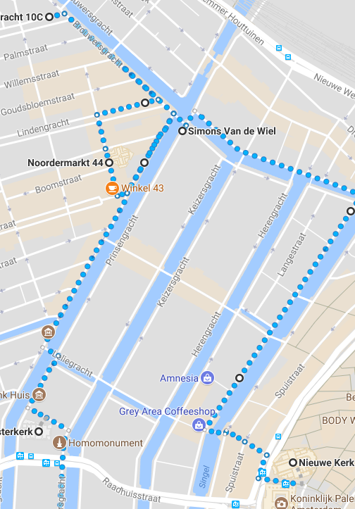 Desde Nieuwe Kerk vamos hasta el cruce de los dos canales una de las mejores fotos de Ámsterdam en el cruce de canales de Brouwerser con Prinsengr, seguimos hasta la iglesia Noorderkerk (barrio Joordan), desde aquí fuimos paseando por el canal hasta la calle Palmgracht, volvemos a la bonita iglesia de Westerkerk, hasta aquí 40 minutos, se puede seguir hasta Rijksmuseum, cuya fachada es preciosa, sería 20 minutos más andando, y ya nos fuimos a Eidhoven para aprovechar a dar un paseo antes de coger el vuelo, y nos sorprendió muy gratamente, merece la pena hacer una parada en esta ciudad de Holanda.