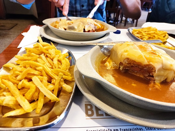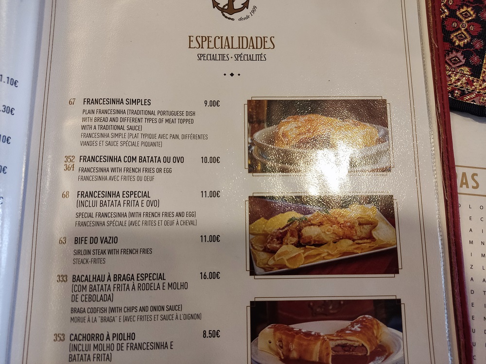 Ya desde aquí nuestra idea era volver andando hasta la estación de metro de Trindade pero antes probar la famosa francesina, que es un sándwich relleno, en nuestro caso, con un gran bistec de ternera, longaniza, bacón, mortadela y con un huevo encima envuelto en queso y gratinado sobre una salsa que en este caso nos supo bastante a vino. Había leído por internet y recomendaban un lugar sencillo pero con una francesina riquísima que difícilmente podías acabar, por 11€ te ponían la francesina completa con una fuente de patatas fritas para cada uno. Os dejo el nombre y la foto de ella, el bar se llamaba Piolho d`ouro muy cerquita de la Torre de los Clérigos y justo en frente de una iglesia con un portón precioso que se llamaba la iglesia del Carmen.